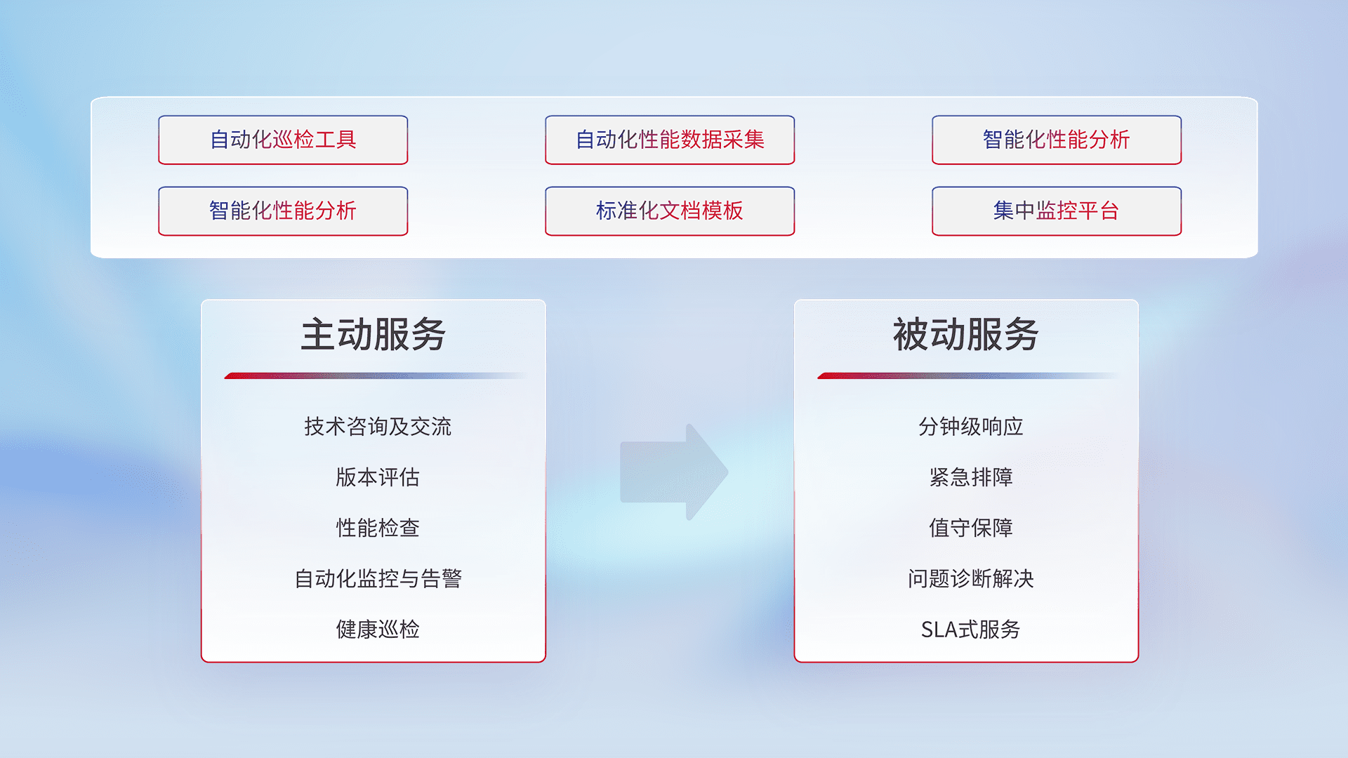 智能化工具和标准化文档,,,保障服务质量,,,,提供主动服务(包含技术咨询、、、、版本评估、、性能检查、、、、自动化监控与告警、、、、健康巡检)和被动服务包含(分钟级响应、、、、紧急排障、、、、值守保障、、、问题诊断解决、、SLA服务)。。。。