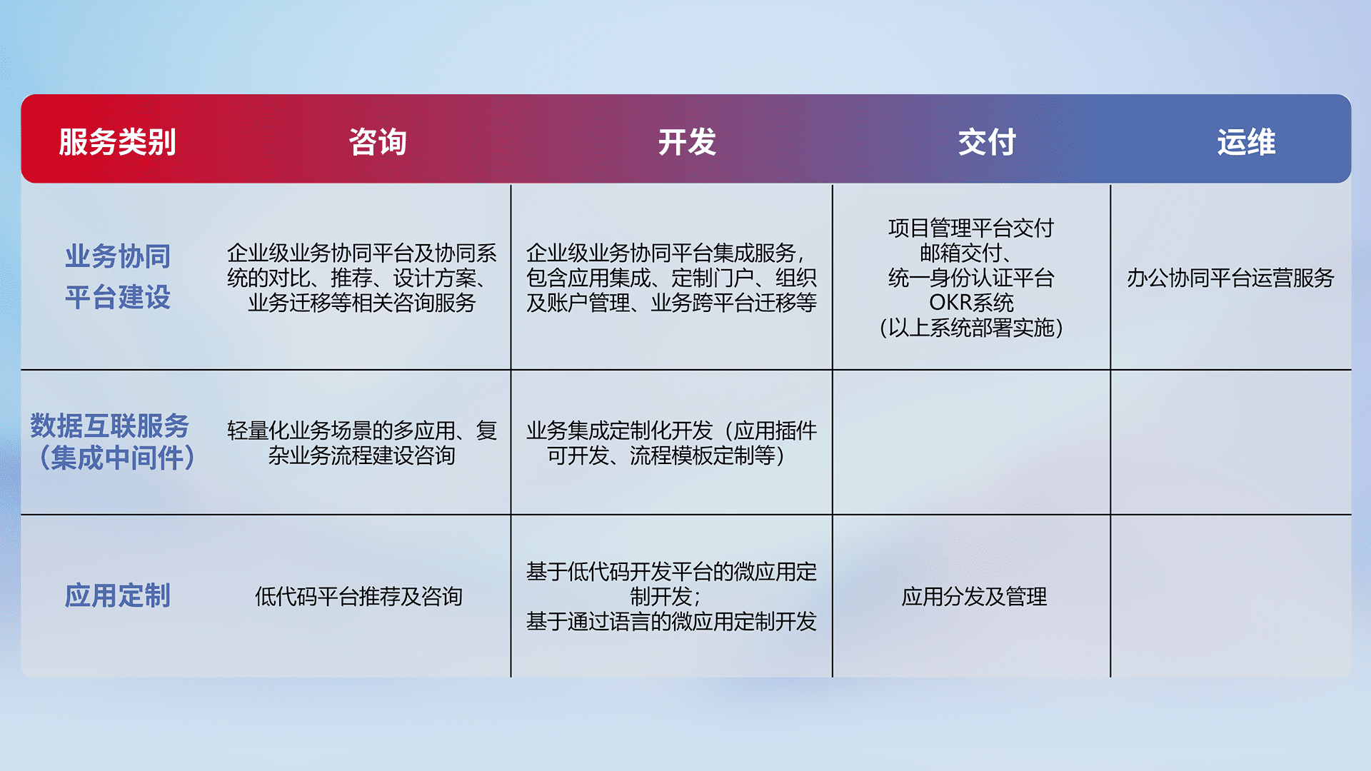 针对钉钉、、、企微、、、IDaas等平台级产品提供产品的规划、、方案、、、、交付、、、、定制化开发等服务,,实现如统一协同办公、、、、智能客户服务、、、、混合会议管理、、、智能数据查询、、、、等业务场景,,,实现数字化转型。。
